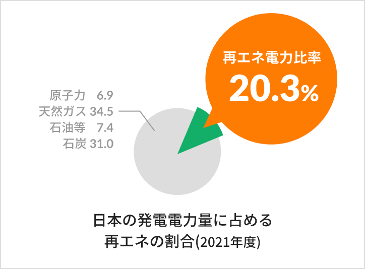 2021年度日本の発電電力に占める再エネ電力の割合は20.3%となっており、まだまだ伸びしろがあります。